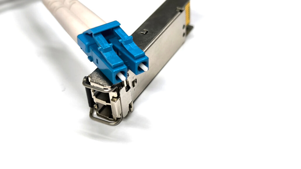 Nahaufnahme eines Multimode-Moduls mit LC-Stecker – ideal fuer kurze Glasfaserverbindungen im Unternehmensnetzwerk